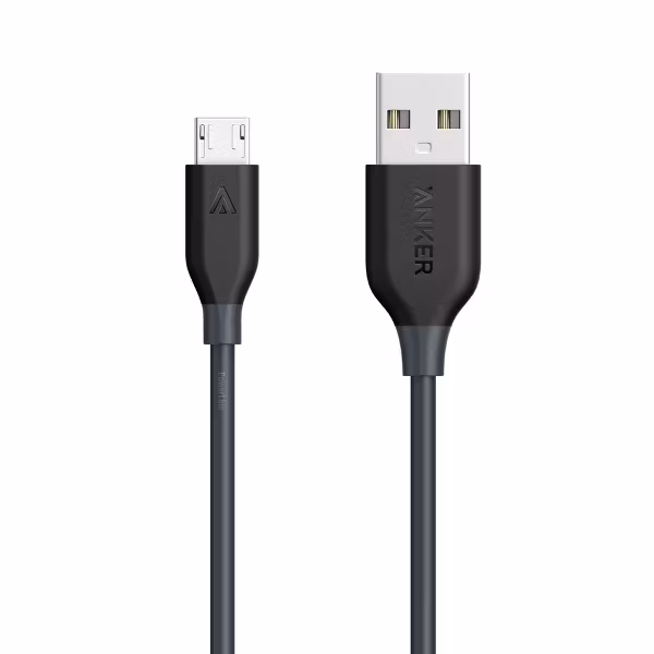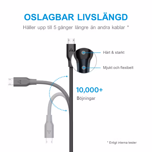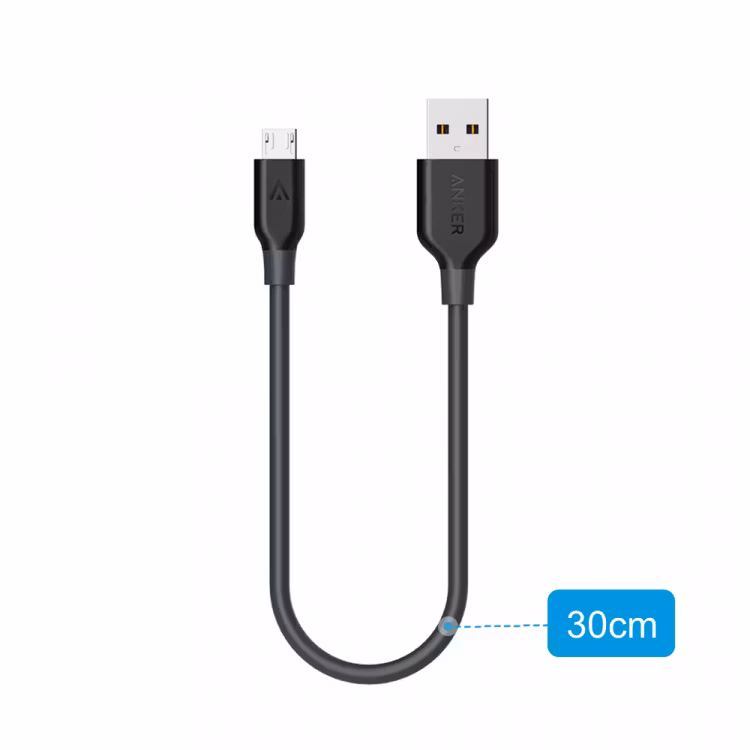 Stark och stryktålig PowerLine Mikro-USB kabel från Anker för synk och laddning. Speciellt tåliga för upprepad böjning. 30cm.