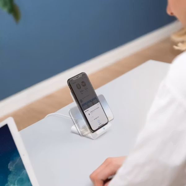 Ställ telefonen i stället så påbörjas laddningen samtidigt som du lätt kan hålla telefonen under uppsikt. Telefonen står stadigt i stället och kan användas samtidigt som den laddar.