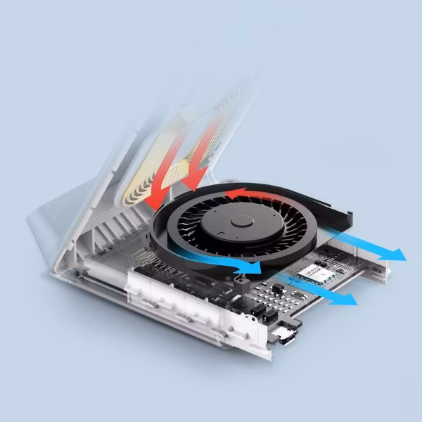 Vid höga laddningshastigheter kan värme bli ett problem. En inbyggd kylfläkt ser till att temperaturer hålls nere så att batteri och laddningshastighet inte påverkas negativt.