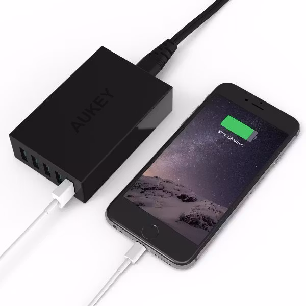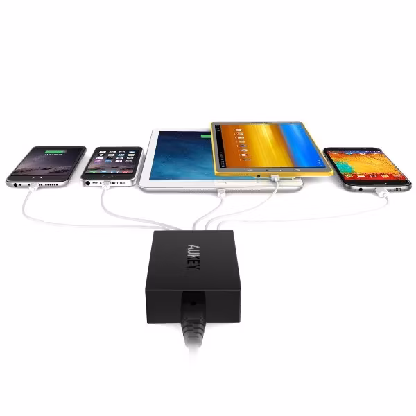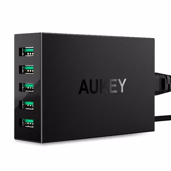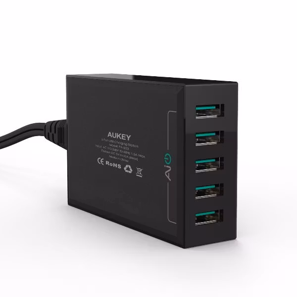 En mobilladdare från Aukey som laddar 5 mobiltelefoner, surfplattor och andra enheter.