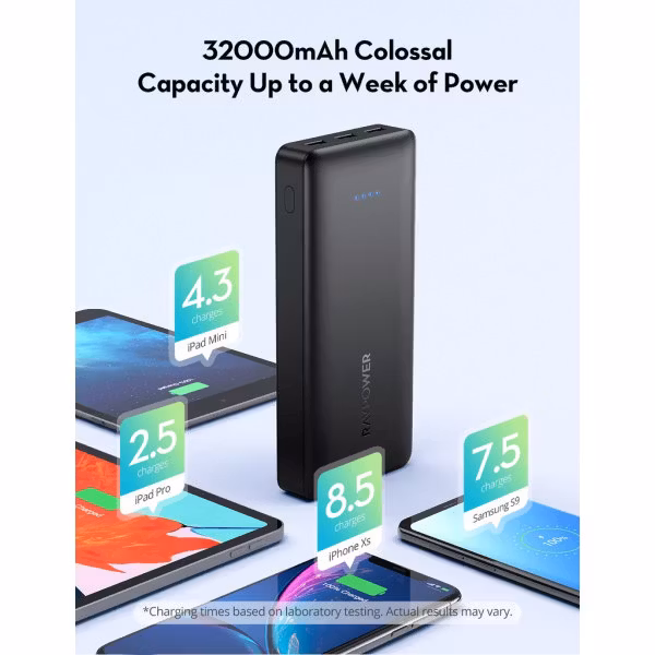 RAVPower 32000mAh powerbank med 3 uttag. Vår största powerbank som kan ladda tre telefoner, surfplattor eller annat samtidigt. Läs mer.