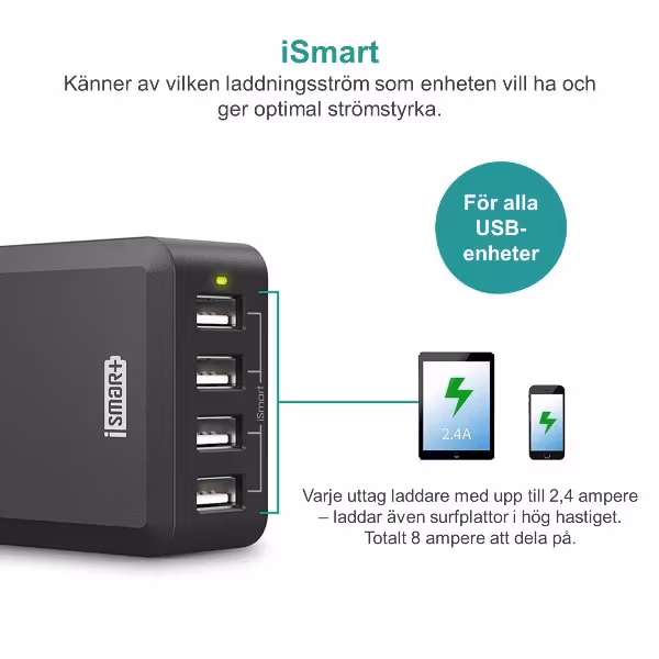 - iSmart som anpassar laddningen till den inkopplade enheten.